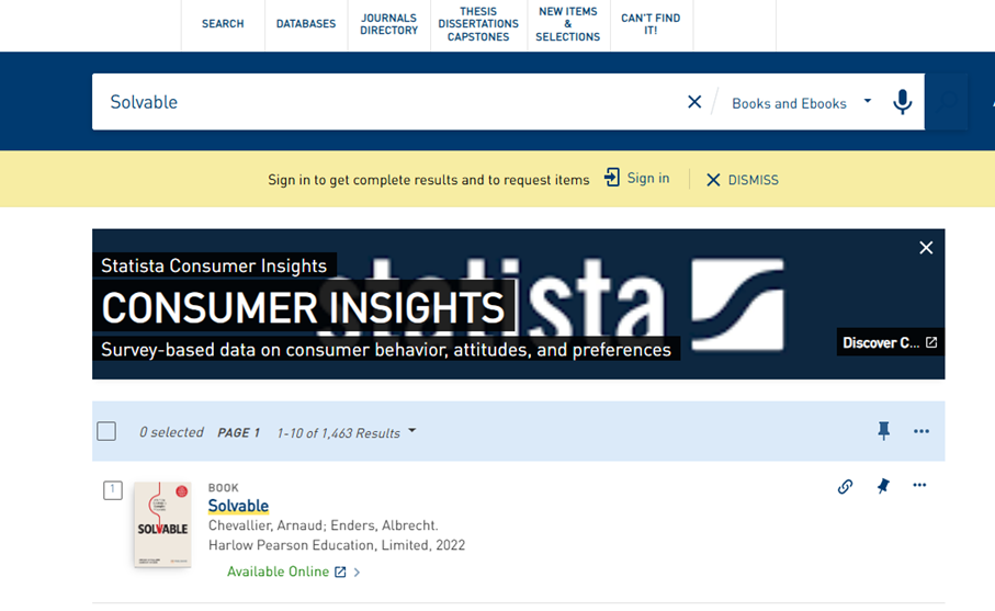 Tous les ouvrages sont signalés dans le portail de recherche du Learning Center (recherche par titre ou par auteur). Par exemple : « Solvable » de Arnaud Chevallier et Albrecht Enders